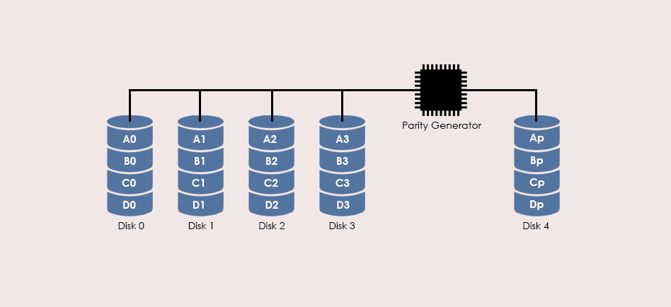 RAID 4 consists of block-level striping with a dedicated parity disk. Parity for same rank blocks is generated on Writes, recorded on the parity disk and checked on Reads.