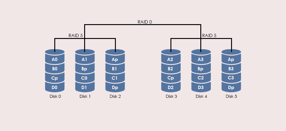 RAID 50, also called RAID 5+0, combines the straight block-level striping of RAID 0 with the distributed parity of RAID 5.
